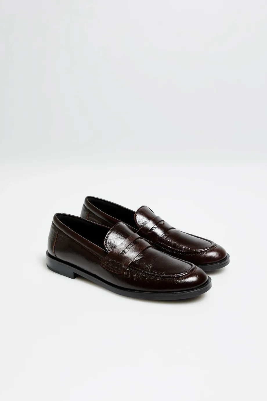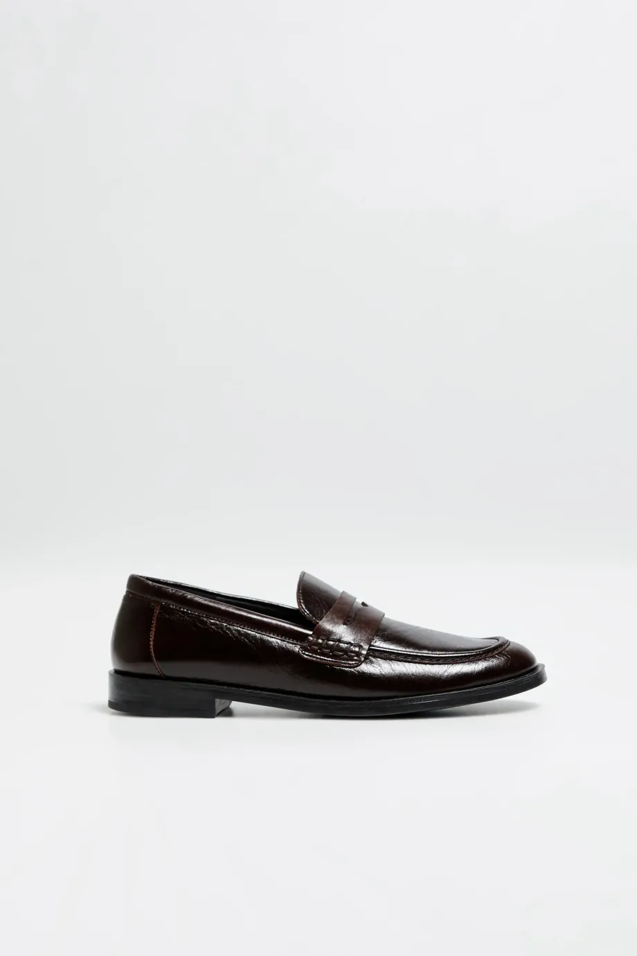 Midikleid in Dunkelbraun, mit geradem, lockerem Schnitt, kurzem, überschnittenem Ärmel und feinem Stehkragen. Aus Wolle gefertigt, im Link-Links-Stich auf einer Maschine mit 15 GG gestrickt. Minimalistisch.